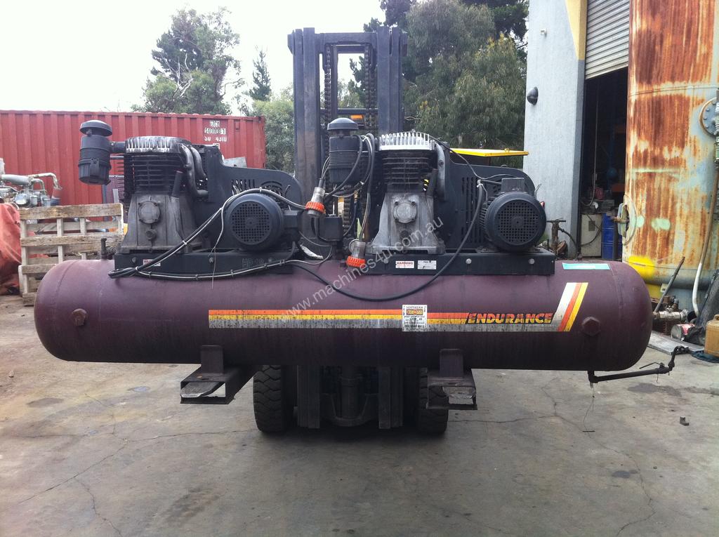 Endurance duplex compressor, 2 x 10 H.P. can easily pull 200 PSI continuously or up to 240 PSI intermittently,
